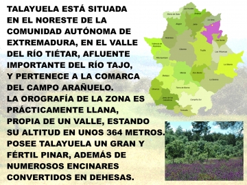 Talayuela está situada en el noreste de la comunidad autónoma de Extremadura, en el valle del río Tiétar, afluente importante del río Tajo, y pertenece a la comarca del Campo Arañuelo, al pie de la comarca de la Vera. La orografía de la zona es prácticamente llana, propia de un valle, estando su altitud en unos 364 metros por encima del nivel del mar. Posee Talayuela un gran y fértil pinar, además de numerosos encinares convertidos en dehesas de aprovechamiento por el hombre. También posee numerosas charcas de importancia, las cuales son refugio y avituallamiento elemental para numerosas especies de la zona y para aves migratorias, que encuentran en estas tierras un refugio ideal y bien provisto de alimentos.